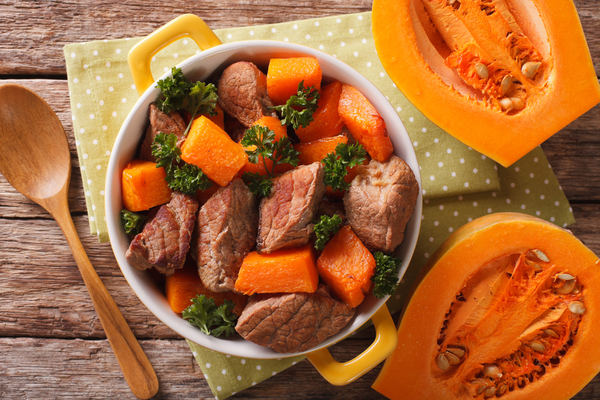 4. Накрыть крышкой и варить на медленном огне в течение примерно двух часов. Добавить морковь и тушить еще полчаса, прежде чем добавить тыкву. Тушить до готовности тыквы, следя за тем, чтобы она не переварилась.
