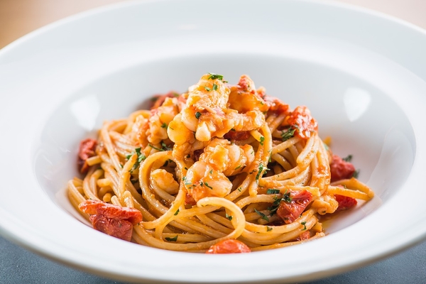 Рецепт итальянской пасты с креветками, вялеными томатами, белым вином, зеленью и чесноком.