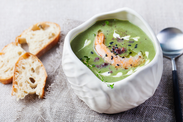 Очень вкусный и ароматный осенний крем-суп из брокколи с жареными креветками.