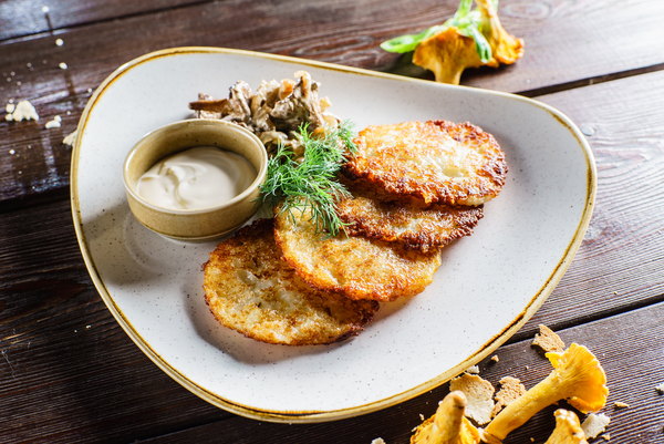 Рецепт драников из картофеля со сметанно-грибным соусом. Вместо лисичек можно использовать шампиньоны или белые грибы.