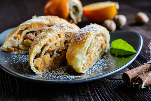 Для этого рецепта осеннего штруделя подойдет как пресное, так и дрожжевое слоеное тесто.