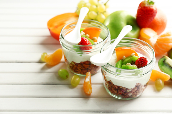 Вкусный и полезный осенний завтрак: гранола с греческим йогуртом и сезонными фруктами.