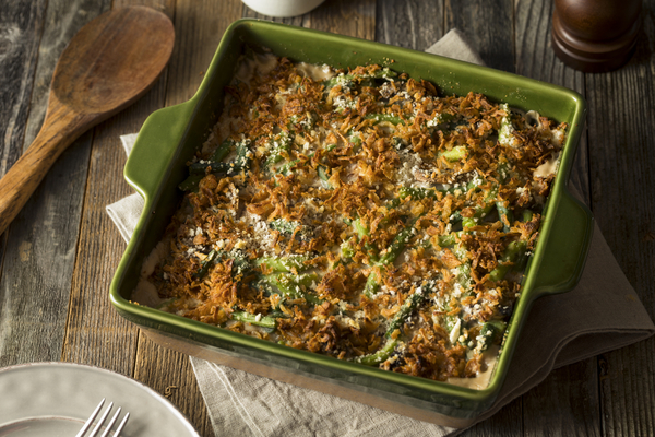 4. Переложить фасоль с грибами в большую форму для запекания и присыпать сверху жареным луком.