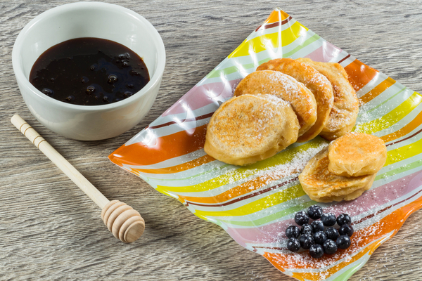 4. Подавать постные оладьи вместе с сахарной пудрой и вареньем.