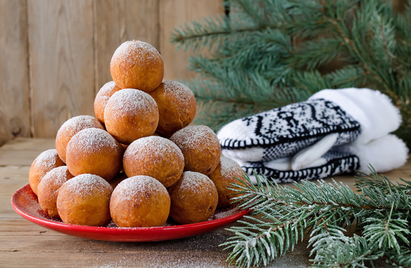 Вкусный десерт на Рождество: аппетитные творожные пончики с посыпкой из сахарной пудры.