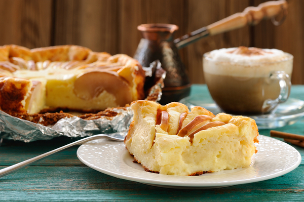 Пышную запеканку из творога и яблок можно подавать со сметаной, вареньем, медом или сгущенным молоком.