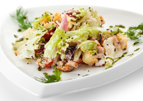 Готовим праздничный салат из копченого филе красной рыбы со свежими овощами, жареными шампиньонами и гренками.