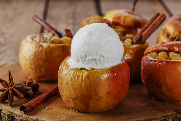 Зимний рецепт десерта: запеченные яблоки с изюмом, орехами и ромом в сливочном соусе.