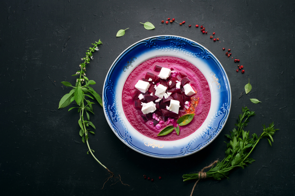 5. Готовый свекольный суп перелить в тарелки и сбрызнуть оливковым маслом. Украсить фетой и веточками тимьяна. Подавать вместе с багетом.