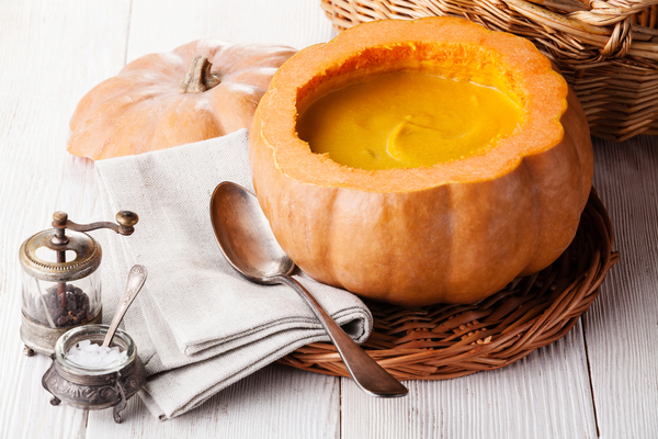 6. Вылить суп в вычищенную круглую тыкву, сверху положить кусочки курицы и запечь в духовке в течение 15-20 минут.