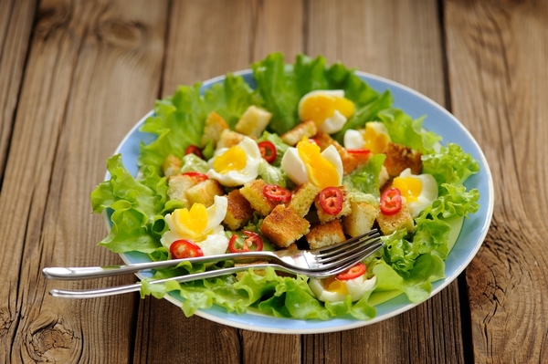 5. Смешать на тарелке салат, яйца, крутоны, сыр с соусом и подавать.