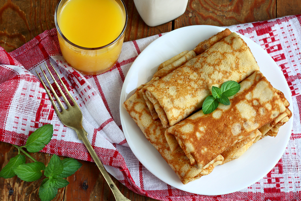 2. Соединить молоко, воду, сахар и масло, постепенно добавить в мучную смесь. Дать тесту постоять полчаса, еще раз перемешать. Испечь тонкие блины.