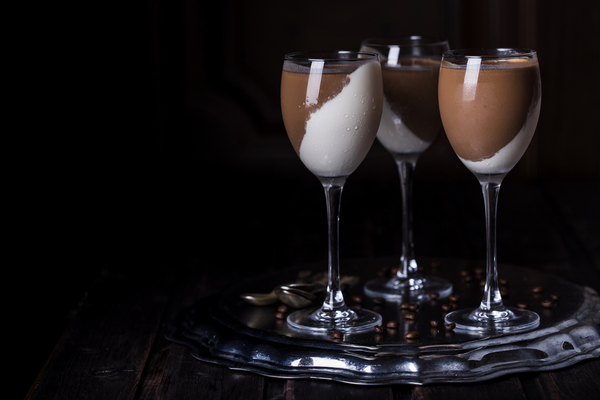 4. Влить шоколадный слой в бокалы и сразу же отправить в морозильную камеру, чтобы он быстрее схватился. Когда желе затвердеет, переставить бокалы в холодильник.
