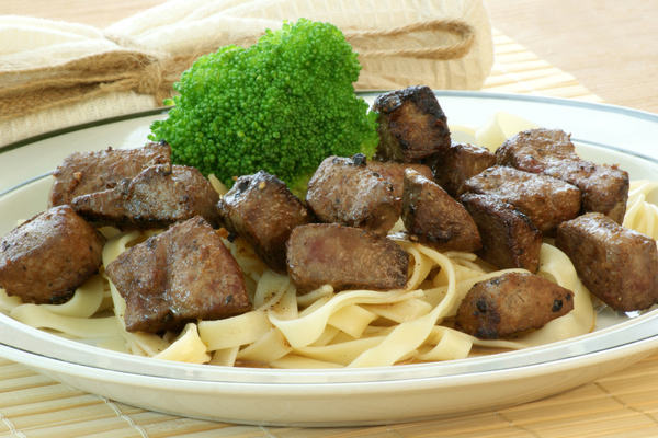 6. Добавить к печени пасту и брокколи, прогреть. Подавать сразу же.