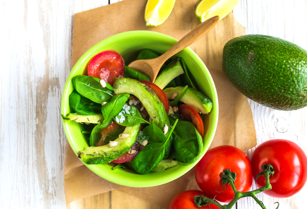 4. Смешать в салатнице промытые листья шпината, помидоры, авокадо и зелень.