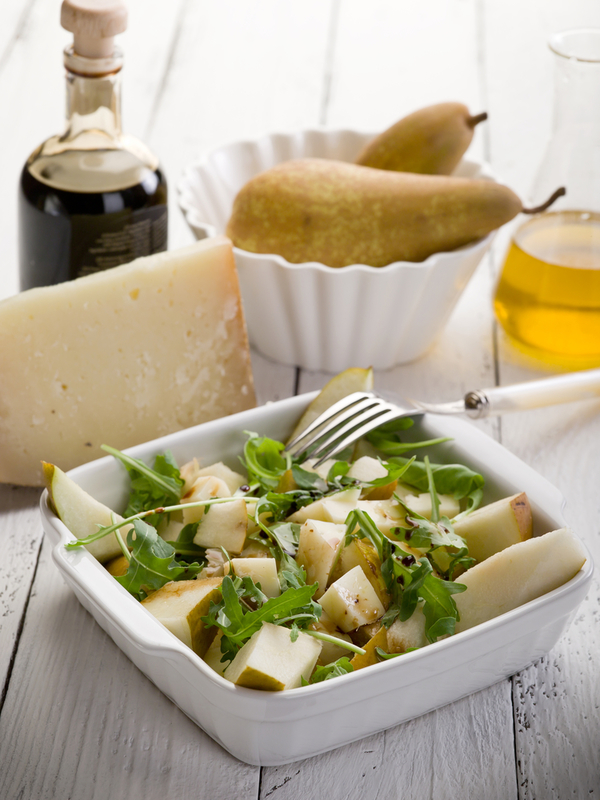 6. В тарелки выложить салатные листья и куриное филе. Сверху разложить груши, полить салат заправкой.