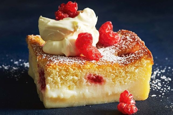 7. Разрезать магический торт на кусочки и посыпать просеянной сахарной пудрой. Подавать со взбитыми сливками и свежей малиной.