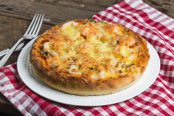 3. Разделить тесто на 4 части. Чашу мультиварки слегка смазать растительным маслом и аккуратно выложить на дно тесто, растягивая его пальцами. Смазать сверху остывшим соусом, выложить морепродукты и маслины. Мультиварку включить на режим Выпечка, и за 10 минут до конца приготовления посыпать пиццу тертым сыром.