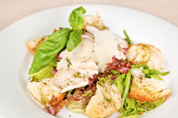 Этот итальянский салат готовится из жареной курицы, цельнозернового хлеба, томатов, зелени и сыра.