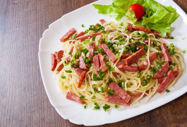 В классическом рецепте итальянскую пасту карбонара готовят с беконом, но его вполне можно заменить колбасой салями.