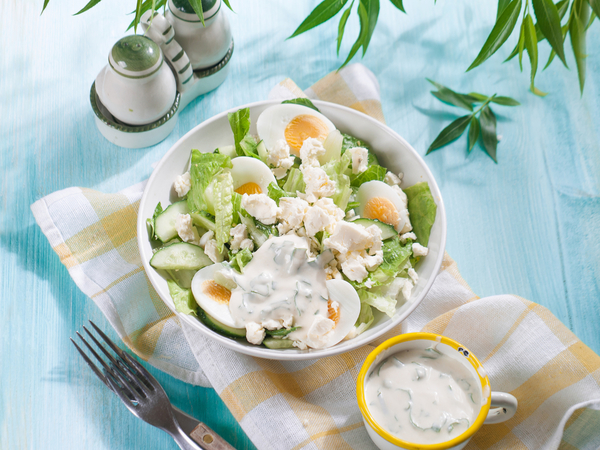 4. Сложить все ингредиенты в салатницу и заправить сметанным соусом. Подавать салат вместе с хрустящим багетом.