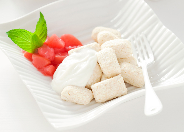 4. Шумовкой переложить ленивые вареники на тарелку. Подавать с обезжиренным йогуртом и диетическим вареньем.