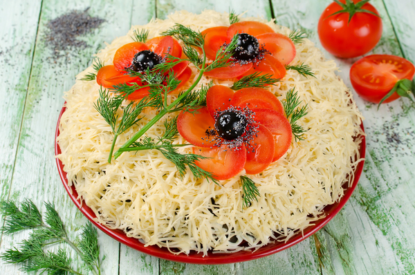 4. Весь салат засыпать тертым сыром. Из помидор вырезать кружочки и сложить из них цветы. В середину вложить половинки маслин. Добавить зелень укропа. Дать салату настояться пару часов в холодильнике.