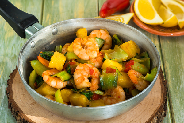 3. Помешивая, добавить чили, рис, размороженные креветки, нарезанные ананасы, соевый и рыбный соусы, полстакана воды.