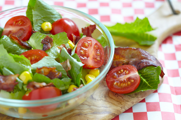 Салат BLT – это классика американской кухни. Его обязательные ингредиенты – бекон, латук и томаты.