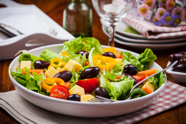 4. Выложить зелень в тарелку, добавить овощи, маслины и нарезанный сыр.