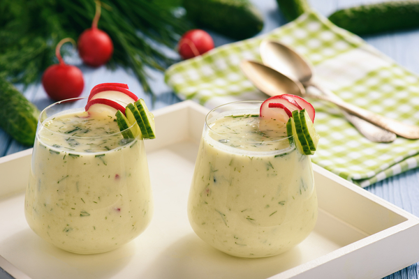 5. Смешать все подготовленные ингредиенты в большой миске и залить кефиром. Приправить по вкусу и перемешать.
