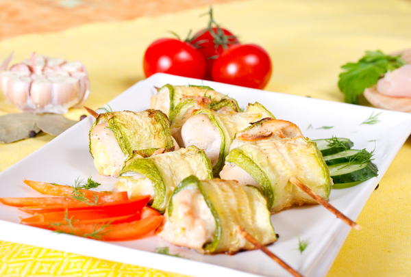 Эта горячая летняя закуска готовится из молодых кабачков с куриным филе, чесноком и сыром. Количество ингредиентов регулируй на свой вкус.