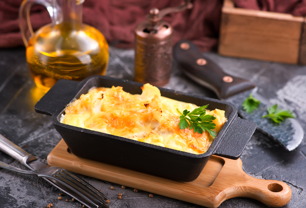 Низкокалорийная запеканка из цветной капусты с двумя видами сыра, молоком, зеленью и чесноком.