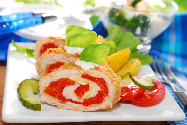 Аппетитные куриные рулетики с сыром и болгарским перцем. Подавай их вместе с запеченным картофелем и свежими овощами.