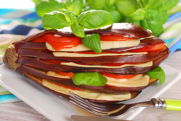 Баклажановый веер с помидорами и сыром