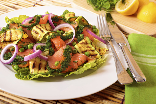 Теплый летний салат из жареных на гриле кабачков, лосося и зеленого горошка с заправкой из соуса песто.