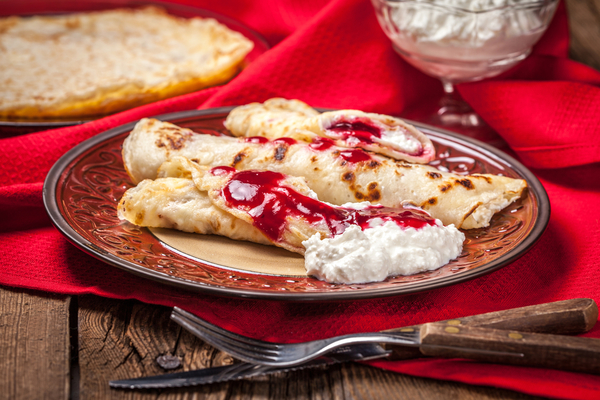 3. Завернуть в блины сладкую творожную массу и вишни. По желанию посыпать тертым шоколадом или сахарной пудрой. Подавать блины вместе со сметаной.