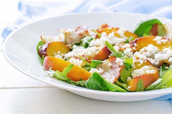 Для этого оригинального салата подойдут как обычные, так и инжирные персики. Зимой его можно готовить с консервированными персиками.