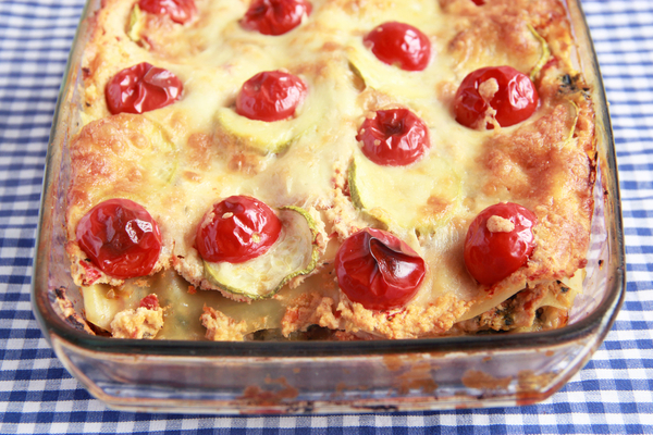 7. Накрыть еще одним слоем теста и снова выложить все ингредиенты начинки. Повторить все еще 2-3 раза, последним должен быть слой начинки. Сверху положить помидорки черри, листья базилика и щедро посыпать пармезаном.