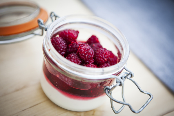 5. Выкладываем малиновое пюре поверх застывшей панна котты. Затем выкладываем оставшуюся малину и посыпаем просеянной сахарной пудрой.