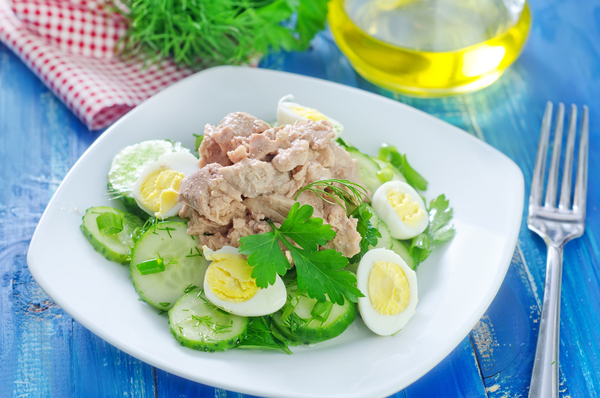 Простой и вкусный салат из печени трески, перепелиных яиц, свежих огурцов и зелени.