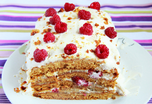 4. Смазать коржи кремом, добавив фрукты и ягоды. Поставить торт в холодильник на несколько часов.