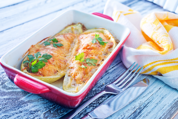3. Кабачки помыть, разрезать вдоль пополам и выскоблить мякоть. Наполнить получившиеся лодочки начинкой.
