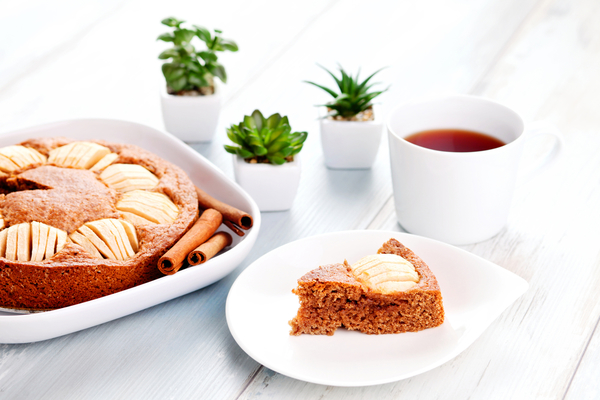 5. Готовое тесто отправить в подготовленную форму. Сверху выложить яблоки, слегка вдавливая их в тесто.