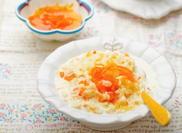 4. Переложить дольки айвы и тыкву к рису, залить молоком.