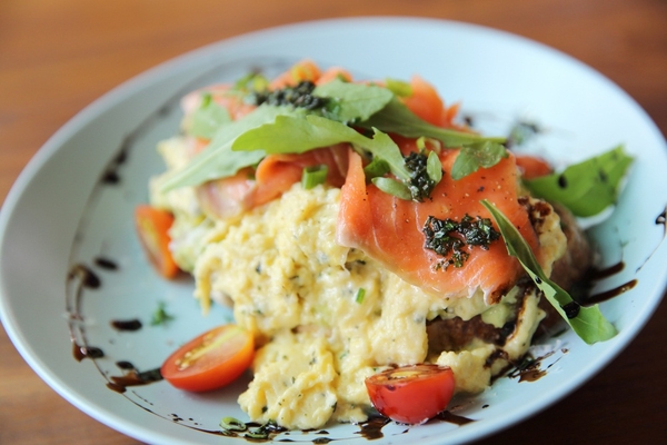 6. Переложить готовый омлет на тарелку, сверху выложить семгу и веточки рукколы.