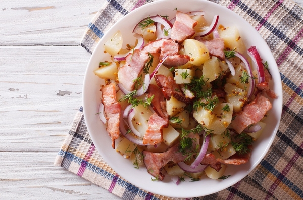 6. В тарелку выложить обжаренный картофель, лук, бекон, полить заправкой и перемешать.
