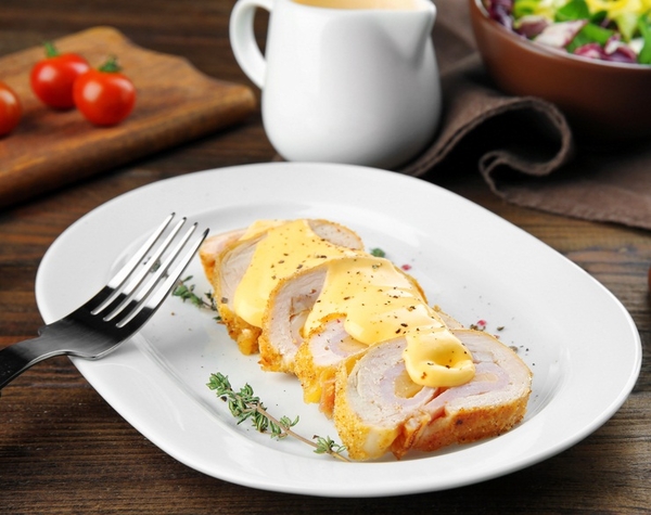 3. На мясо выложите сыр, ветчину и еще раз сыр.