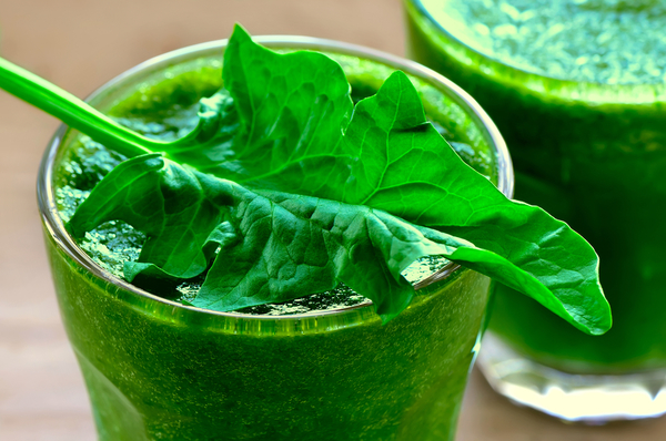 2. В блендере смешайте апельсиновый сок, листья шпината и зелень до однородности.