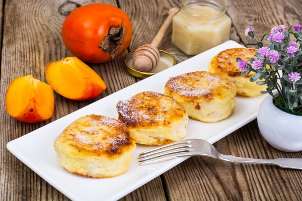 Рецепт сладких сырников с ванилью и хурмой. Вместо хурмы можно добавить изюм или курагу.